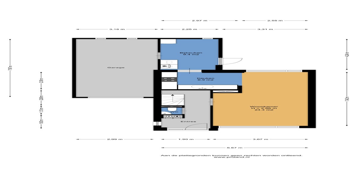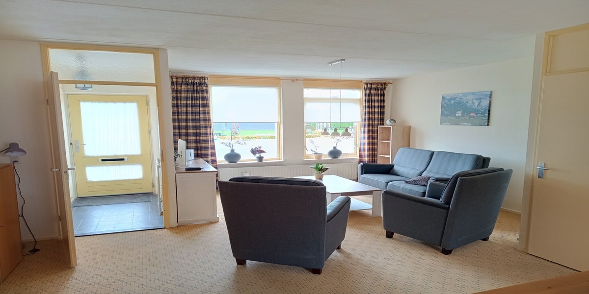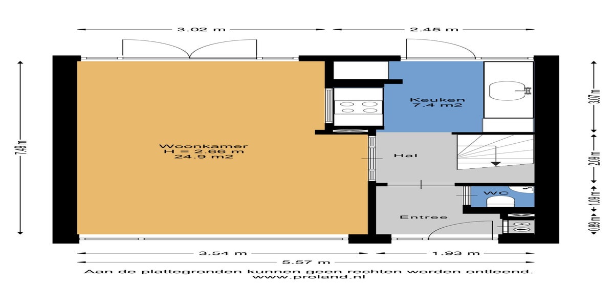 Hal/entree met het toilet en de trap naar de eerste verdieping. Woonkamer. Keuken met de deur
