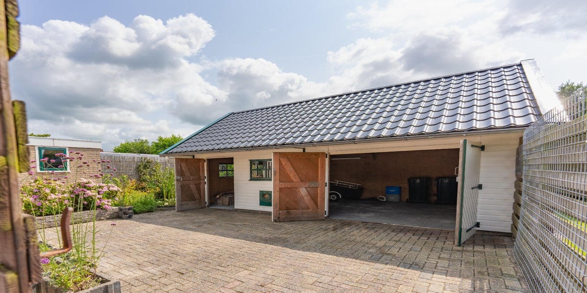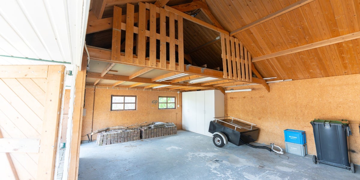 Grote vrijstaande schuur/ garage (ca 30m2) met een gedeeltelijke verdieping. De garage heeft een dubbele deur en een loopdeur. De vloer is van beton.