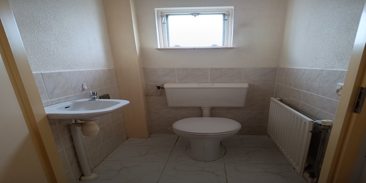 Gang, badkamer met een ligbad, douche-hoek en wastafel. Separaat toilet. Bijkeuken met deur naar de achtertuin.