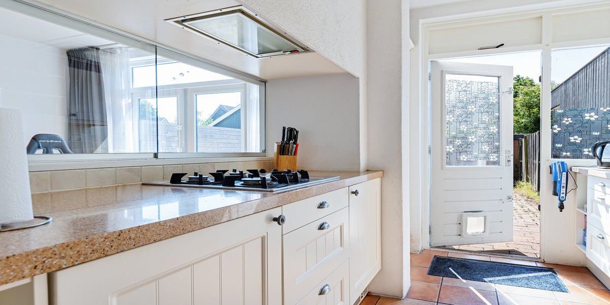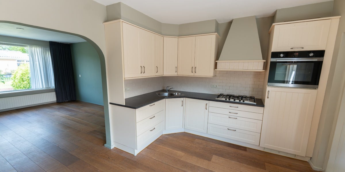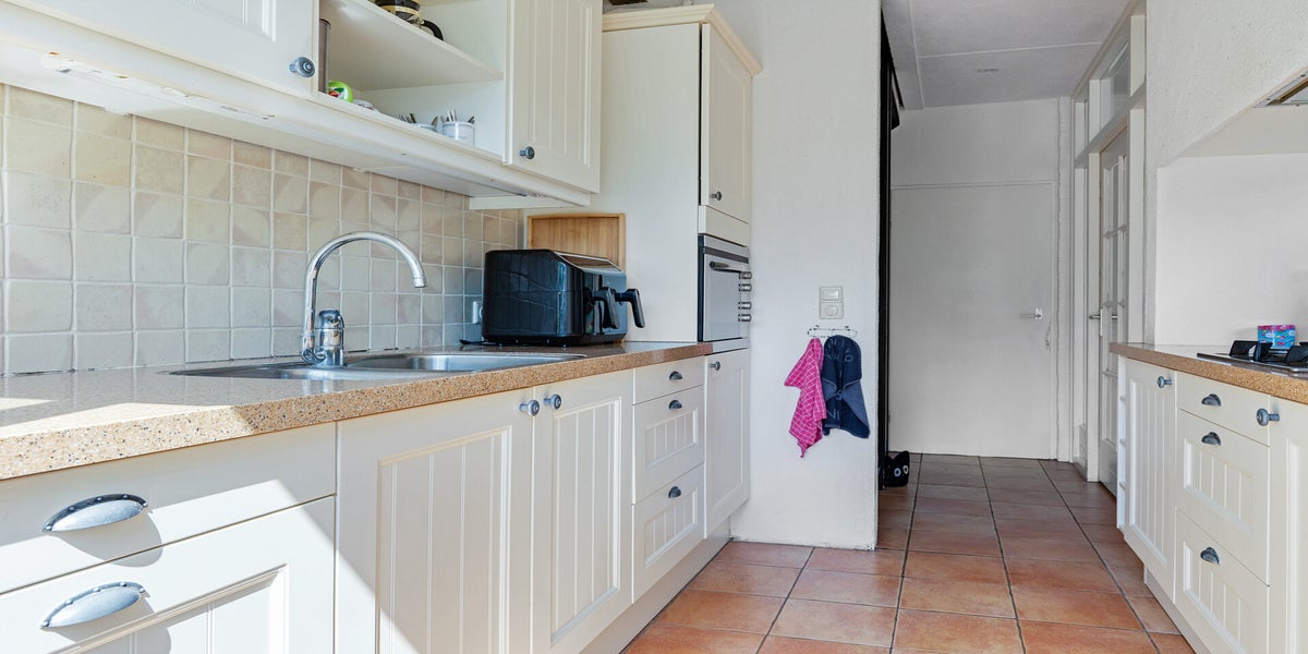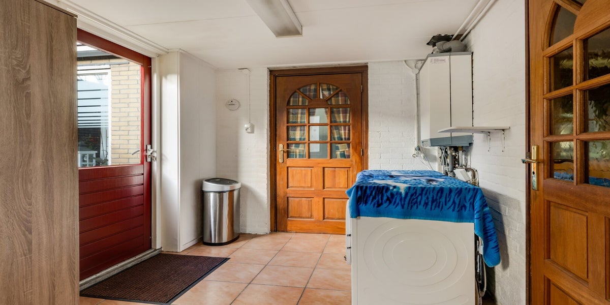 Aangebouwde bijkeuken met een deur naar de achtertuin en een deur naar de ruime aangebouwde garage.