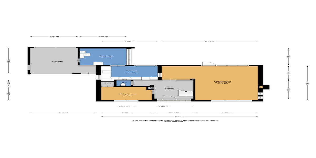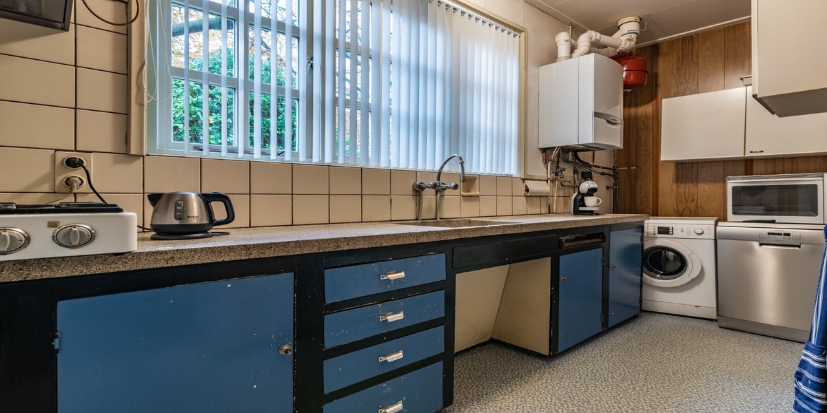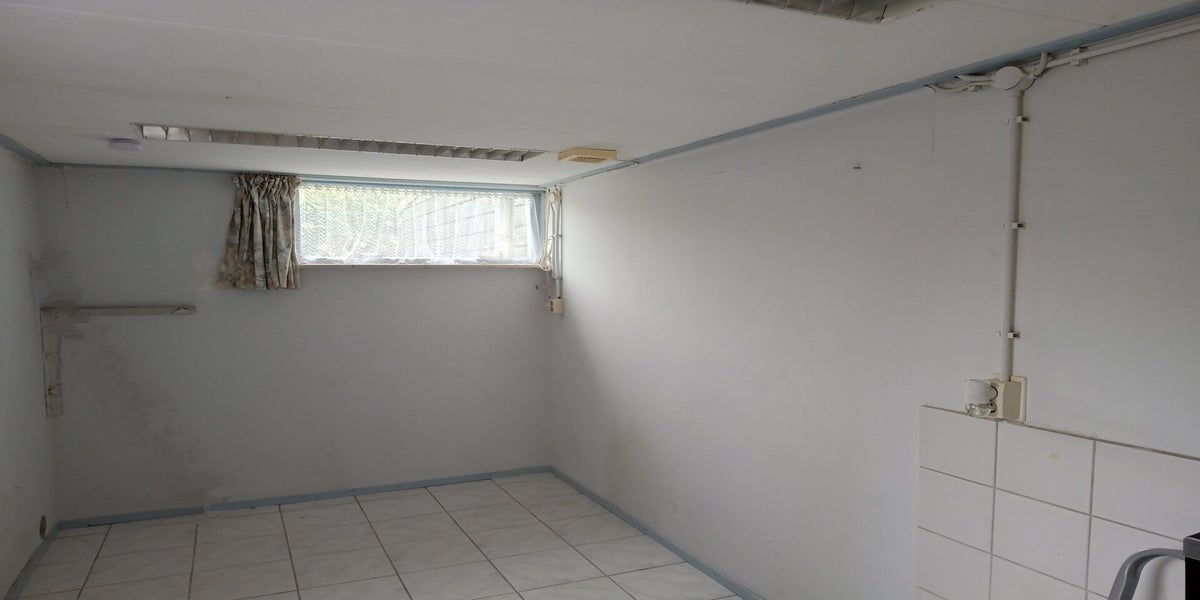 Slaap/werkkamer. Bijkeuken met de cv-ketel, de aansluitingen voor witgoed en een deur naar de