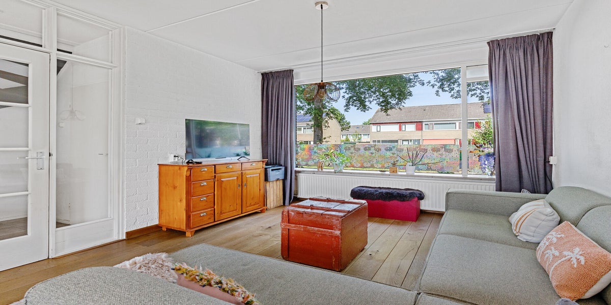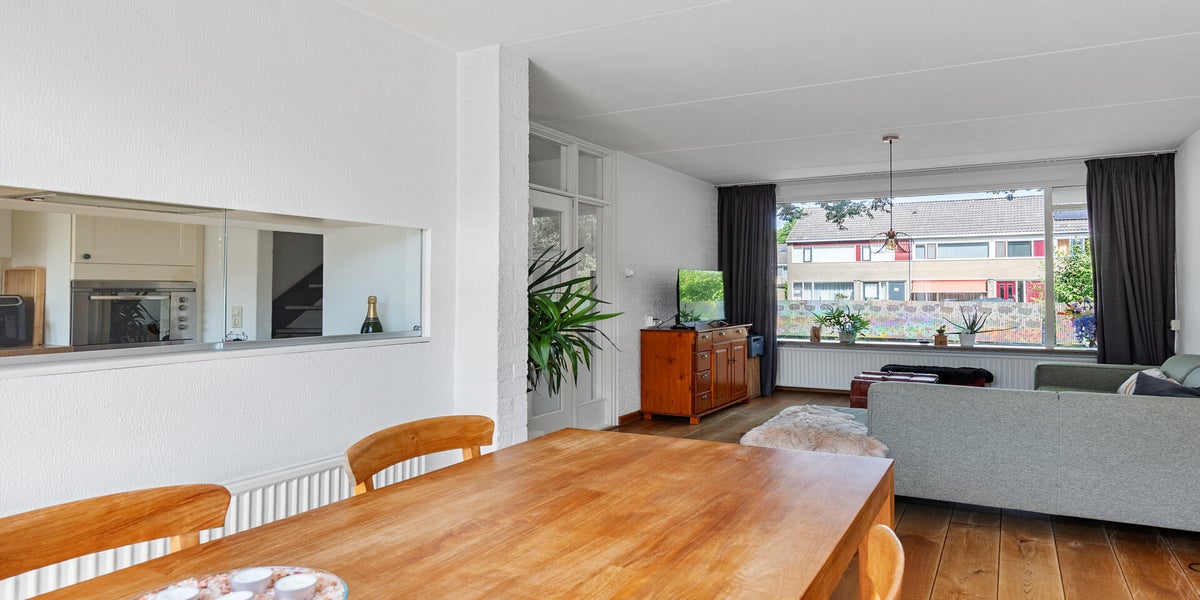Begane grond: Hal/entree met de meterkast. Z-vormige woonkamer met open keuken. De keuken is voorzien van een 4-pits kookplaat en een afzuigkap. De woonkamer heeft een ruime vaste kast. Vanuit de keuken is de bijkeuken bereikbaar, waar zich de aansluitmogelijkheid bevindt voor de wasmachine e.d. Tussenhal met het toilet en de trap naar de eerste verdieping.