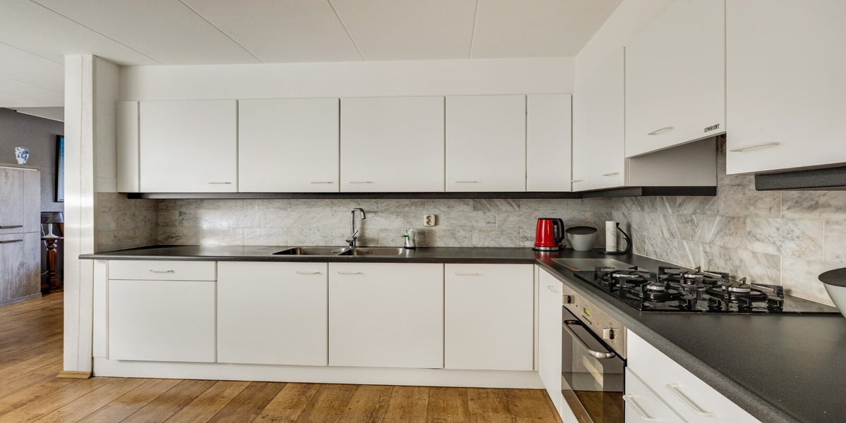keuken is voorzien van een dubbele gootsteen, een inductie kookplaat en afzuigkap.