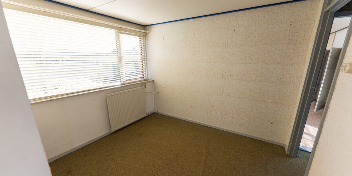 Slaapkamer en een grote open ruimte met mogelijkheden voor meerdere slaap- of hobbykamers.