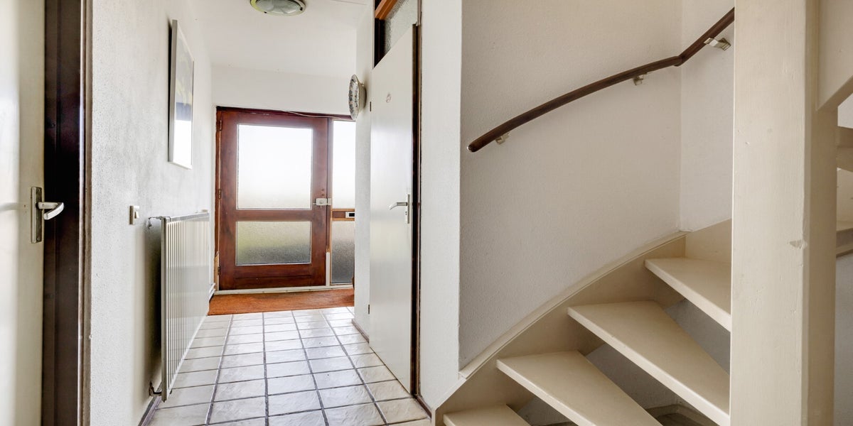 Zij-entree met de trap naar de eerste verdieping. Woonkamer met voldoende ruimte voor het realiseren van een werk- dan wel speelhoek en met toegang tot de kelder met voldoende